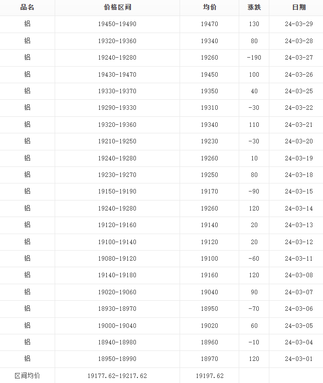 一月:图一是2024年1月份铝价报表,通过图片大家可以清楚地看到1月份铝锭区间均价是19055.45元/吨-19095.45元/吨,均价是19075.45元/吨,整体涨跌幅度不大,在19000元/吨左右波动。图二是1月份铝价变动曲线图,通过该图可以让大家对这个月的价格走势一目了然。