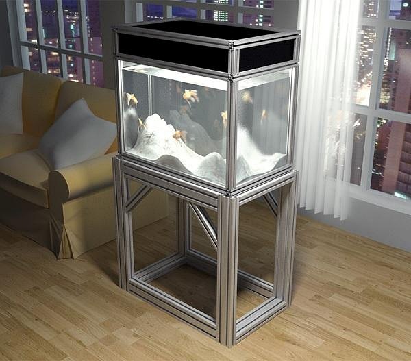 图中鱼缸架子使用十字打孔连接,使用配件半圆头螺栓+弹性扣件+内六角螺栓实现整体框架组装。